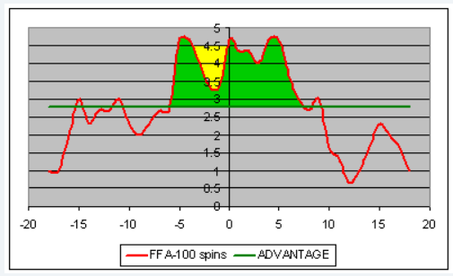 [i]Anything above green line is advantage. If we read values we can see that pick point is only 2.85 and green line is at 2.78 so the difference is 0.07. It means that for every 100 spins played we would win 35x0.07=2.45 units. Or if we round it up, we can say every 200 spins we should profit 3 units. Theoretically it will work; you can play for 10 hours and win few bucks.