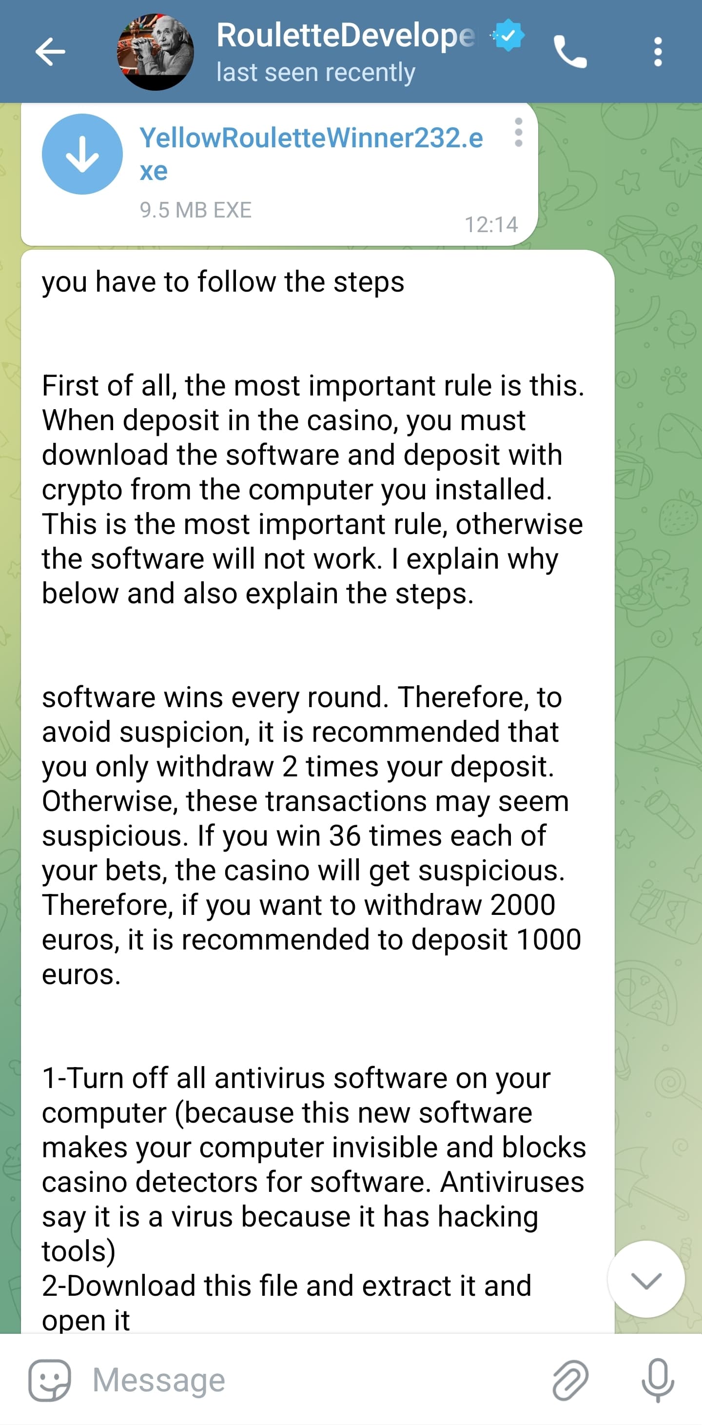 There are too many scammer, roulette professors, shadow roulette, roulette developer and more their are some scammers that give you trojan and steal your money and data
